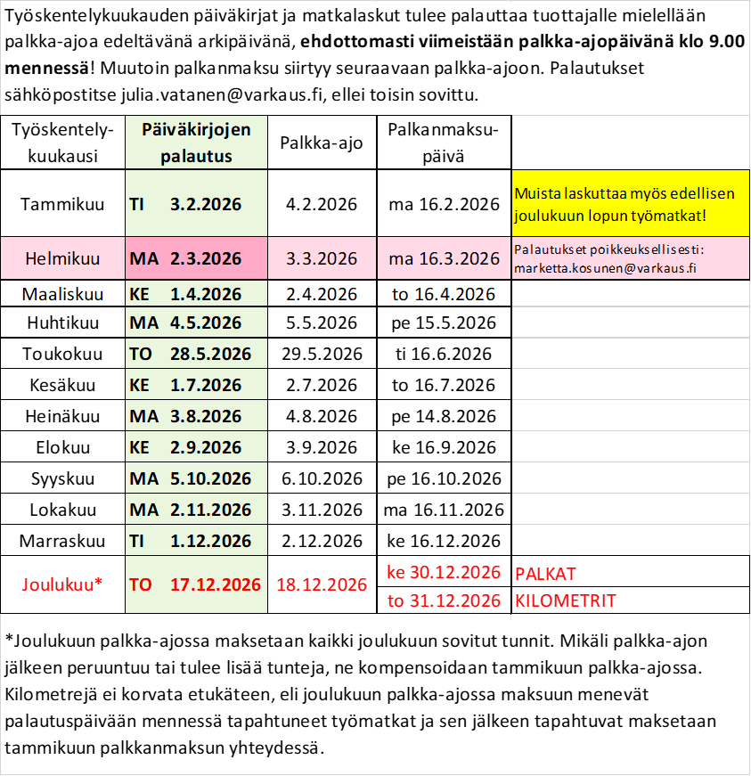 Päiväkirjojen ja matkalaskujen palautusaikataulu 2026: